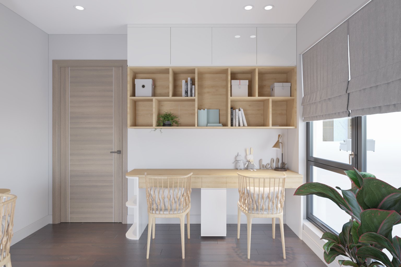 Phòng học của các con được ưu tiên vị trí phòng sáng thoáng nhất căn hộ. Phòng được thiết kế tối giản, đảm bảo không gian học của các con, có khoảng trống cho cậu út lăn lê bò toài vẽ tranh, nằm đọc sách hoặc chơi đồ chơi, nô đùa cùng các chị.